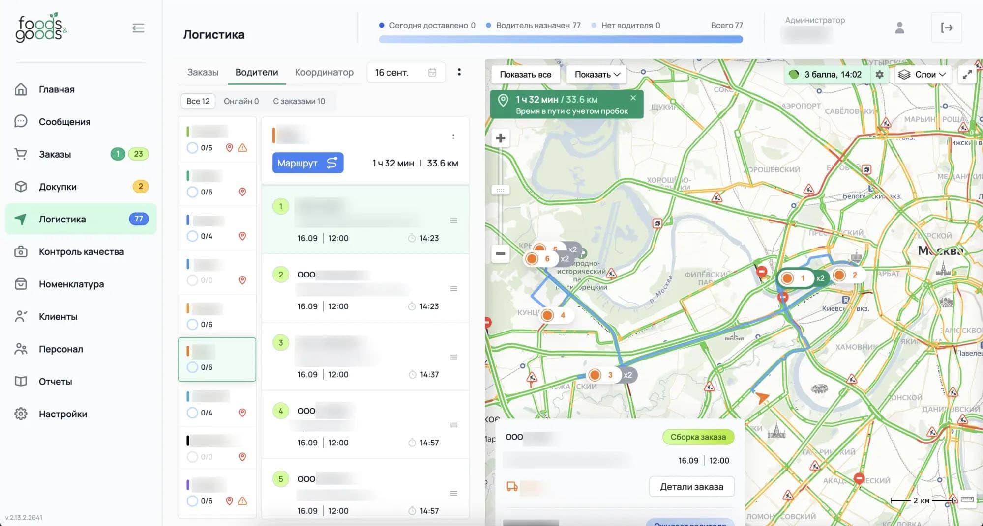 В режиме реального времени на карте видно как двигаются курьеры, нет ли у них проблем. К примеру, когда клиент принимает заказы в приложении, каждую отдельную позицию он может принять полностью, частично или отказаться. Все это он отмечает в приложении сам или просит курьера, у которого также есть возможность вносить такую информацию. По завершении приемки есть возможность оставить оценку и комментарий.